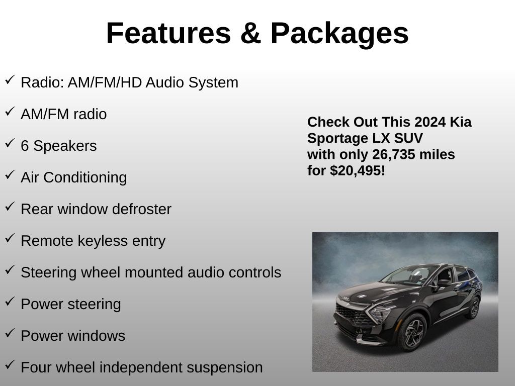Certified. Fusion Black 2024 Kia Sportage LX FWD 8-Speed Automatic I4 17" Alloy Wheels, 4-Wheel Disc Brakes, 6 Speakers, ABS brakes, Air Conditioning, Alloy wheels, AM/FM radio, Auto High-beam Headlights, Axle Ratio: 3.648, Brake assist, Bumpers: body-color, Carpeted Floor Mats, Cloth Seat Trim, Delay-off headlights, Driver door bin, Driver vanity mirror, Dual front impact airbags, Dual front side impact airbags, Electronic Stability Control, Four wheel independent suspension, Front anti-roll bar, Front Bucket Seats, Front Center Armrest, Fully automatic headlights, Illuminated entry, Low tire pressure warning, Occupant sensing airbag, Outside temperature display, Overhead airbag, Overhead console, Panic alarm, Passenger door bin, Passenger vanity mirror, Power door mirrors, Power steering, Power windows, Radio: AM/FM/HD Audio System, Rear anti-roll bar, Rear seat center armrest, Rear side impact airbag, Rear window defroster, Rear window wiper, Remote keyless entry, Security system, Speed control, Speed-sensing steering, Split folding rear seat, Spoiler, Steering wheel mounted audio controls, Tachometer, Telescoping steering wheel, Tilt steering wheel, Traction control, Trip computer, Variably intermittent wipers.