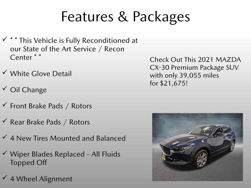Discover the perfect blend of style, performance, and versatility with this stunning 2021 Mazda CX-30 Premium. Boasting a sleek blue exterior and a well-appointed interior, this SUV is ready to elevate your driving experience.