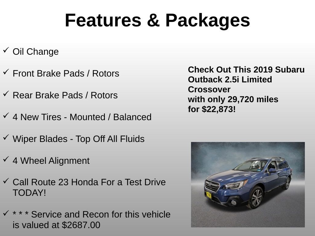 Oil Change, Front Brake Pads / Rotors, Rear Brake Pads / Rotors, 4 New Tires - Mounted / Balanced, Wiper Blades - Top Off All Fluids, 4 Wheel Alignment, Call Route 23 Honda For a Test Drive TODAY!, * * * Service and Recon for this vehicle is valued at $2687.00, 12 Speakers, 18" Alloy Wheels, 4-Wheel Disc Brakes, 4.111 Axle Ratio, ABS brakes, Air Conditioning, Alloy wheels, AM/FM radio: SiriusXM, Auto-Dimming Rear View Compass Mirror w/HomeLink, Auto-dimming Rear-View mirror, Automatic temperature control, Brake assist, Bumpers: body-color, CD player, Compass, Driver door bin, Driver vanity mirror, Dual front impact airbags, Dual front side impact airbags, Electronic Stability Control, Emergency communication system, Exterior Parking Camera Rear, Four wheel independent suspension, Front anti-roll bar, Front Bucket Seats, Front Center Armrest w/Storage, Front dual zone A/C, Front fog lights, Front reading lights, Fully automatic headlights, Garage door transmitter, harman/kardon Surround Sound Speaker System, harman/kardon® Speakers, Heated door mirrors, Heated Front Bucket Seats, Heated front seats, Heated rear seats, High Beam Assist (HBA), Illuminated entry, Leather Shift Knob, LED Steering Responsive Headlights, Low tire pressure warning, Memory seat, Moonroof & Navigation & HBA & RAB & LED SRH, Occupant sensing airbag, Outside temperature display, Overhead airbag, Overhead console, Panic alarm, Passenger door bin, Passenger vanity mirror, Perforated Leather-Trimmed Upholstery, Power door mirrors, Power driver seat, Power Liftgate, Power Moonroof Package, Power passenger seat, Power steering, Power windows, Radio: Subaru STARLINK 8.0" Multimedia Nav System, Radio: Subaru STARLINK 8.0" Multimedia Plus System, Rear anti-roll bar, Rear seat center armrest, Rear window defroster, Rear window wiper, Remote keyless entry, Reverse Automatic Braking (RAB), Roof rack, Security system, Smartphone Integration, Speed control, Speed-sensing steering, Split folding rear seat, Spoiler, STARLINK/Apple CarPlay/Android Auto, Steering wheel mounted audio controls, Steering Wheel Paddle Shift Control Switches, Tachometer, Telescoping steering wheel, Tilt steering wheel, Traction control, Trip computer, Turn signal indicator mirrors, Variably intermittent wipers, Vehicle Information Display. Odometer is 50842 miles below market average! Clean CARFAX.